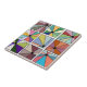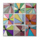 Diese Keramik-Kachel hat ein abstraktes Design, das aus neun Quadraten besteht, mit einem Kreis und "Strahlen", die aus dem Kreis in vielen verschiedenen Farben kommen.