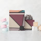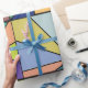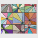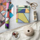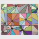 Dieses Verpackungspapier hat ein abstraktes Design, das aus neun Quadraten besteht, mit einem Kreis und "Strahlen", die aus dem Kreis in vielen verschiedenen Farben kommen.