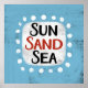 "Sun Sand Sea" ist ein lustiges Textdesign mit weißer Akzent-Form, umgeben von weißen, weißlichen, weißlichen, weißgetönten Punkten.