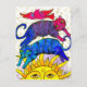 Zwei kleine Tubby-Katzen springen in einem schönen Solstice-Tanz über die Sonne, mit einem Vogel, der über der Sonne fliegt.