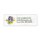 Die links Seite dieser Rücksendeadressen-Aufkleber zeigt ein Aquarellbild einer zauberhaften Tri-Farbe Cavalier King Charles Spaniel Hund unter verstreuten Sonnenblumen und Eukalyptus-Blätter. Ihr eigener Text ist rechts grün und dunkelgrau. Eine kleine Auswahl an feinen Goldkonfetti verleiht dem Hintergrund ein wenig mehr Interesse.