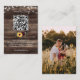 The design showcases a prominently placed QR code, allowing guests to quickly scan and RSVP online, making responses simple and convenient. Beneath the code, clear instructions guide guests to your wedding website, where they can confirm attendance and access important details like schedules, directions, and accommodations. The sunflower and deep burgundy rose floral accents add a rich, elegant contrast against the rustic woodgrain background, creating a look that feels both inviting and refined.