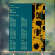 This bold modern teal blue and gold sunflower wedding seating chart features artistic sunflower silhouettes with integrated teal accents and luxe striped patterns, creating an elegant table setting that ties your entire celebration together. Clean typography presents your couple names, wedding date, and seating plan with your guests' names.