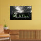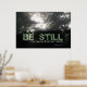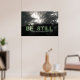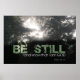 Seien Sie still und wissen, dass ich ein Gottesposter bin, mit einem Foto Sonnenlicht, das durch Nebel gerahmt von Bäumen scheint.