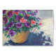 Ein Topf Petunien auf der Eingangsterrasse, beleuchtet durch die Weise der Nachmittagssonne gerade, "Willkommen."