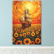 Bring a touch of dreamlike fantasy into your home with this amazing surrealist painting. This unique work of art features a majestic multi-masted sailing ship sailing through an endless and vibrant field of blooming sunflowers. The sky above the swirls with thick and expressive brush strokes in warm shades of orange, yellow and red, reminiscent of scorching sunsets and classical post-Impressionist masterpieces. The warm colors and imaginative concept make this piece a perfect conversation starter and a beautiful addition to any room.