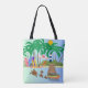 Sunny Beach Schildkröten Leuchtturm Print Tote Tag zeigt die einfache Szene eines sonnigen Strandtages mit Schildkröten, Leuchtturm und Surfbretter gewartet, um genossen werden.