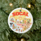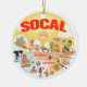 Ein spektakulärer Cartoon Südkaliforniens - mit Los Angeles, Anaheim, Long Beach, San Diego und vielen anderen Städten und den meisten Stränden. Diese skurrile Szene ist voller Spaß - ein Surfer hängt zehn, während eine Meerjungfrau auf einem Felsen sitzt, ein Killerwal aus dem Wasser springt und ein Bull in einen Bullenkämpfer stürzt, alles unter der warmen kalifornischen Sonne, die hoch über alles scheint.