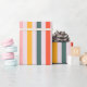 The paper features a large-scale, mid-century modern geometric pattern consisting of horizontal stripes. The design uses a coordinated mix of muted coral, sunny mustard yellow, and sage green set against a soft lavender or pale pink background. Perfect for birthdays, holidays, or everyday gifting, this design adds a joyful pop of color to any present—no extra embellishments needed.