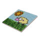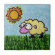 Hübsche, kleine, gelbe Schafe mit rosa Gesichtsausdruck, stehend in einem Feld von Leuchtern, an einem hellen und sonnigen Tag. Originelle Cartoon-Kunst von Taylor Addams. Wir werden es Liebe!