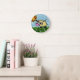 Hübsche, kleine, gelbe Schafe mit rosa Gesichtsausdruck, stehend in einem Feld von Leuchtern, an einem hellen und sonnigen Tag. Originelle Cartoon-Kunst von Taylor Addams. Gute Uhr für ein Kinderzimmer. Wir werden es Liebe!