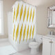 Dieses Kunstwerk enthält Rhombus-Muster, die ein ausgeprägtes Zusammenspiel von warmen, sonnengoldfarbenen Formen auf einer klaren, hellen, weißen Leinwand schaffen und einen geometrischen Duschvorhang ergeben.