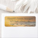 Sonnenaufgang am Strand, Rücksendeadressen-Aufkleber mit Skript-Schriftart. Ein goldener Sonnenaufgang über Meer und Sand ist der Hintergrund für dunkelblaue Schrift.