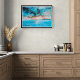Vibrant hues of blue and orange blend to depict a dynamic seascape with a dramatic sky. The transition between the sky and water creates a sense of movement and depth.
