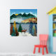 Eine wunderschöne Landschaft mit einzigartigen Farben und Texturen, die eine Berg- und Seenlandschaft und einen mehrfarbigen Wald mit aufsteigender Sonne und einem Elch in den Farben Blau, Grün, Gold und Magenta zeigen.