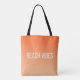 VIVIDLUXE Moderner Lässiger Stil. Die Tote Tag, die von einem perfekten Sonnenuntergang am Strand Inspiriert wird, zeichnet sich durch eine sanfte Abstufung von tieforange bis weichem Beige aus, die die Wärme des Sandes und des Abends in sich trägt. Die kühne, moderne Typografie fügt ein stilvolles "BEACH VIBES" Statement hinzu. Ideal, um das Wesentliche am Ufer zu tragen oder um eine Touch im sommerlichen Stil überall hinzugeben.