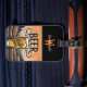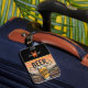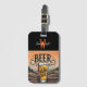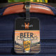 Ein Glas Bier sitzt auf einem Holzzaun mit einem Sonnenuntergang im Hintergrund. Das Glas ist mit dem Text Beer ist mein Happy Juice beschriftet.
