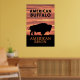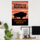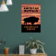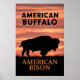 Eine Silhouette amerikanischer Büffel, die gegen einen lebhaften orangen Sonnenuntergang stehend ist.