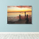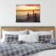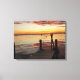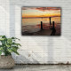 Sunset Dolphins Canvas Print. Delfine schwimmen bei einem romantischen Sonnenuntergang in der Nähe eines Docks. Extra dick Canvas Print.