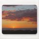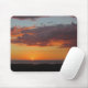 Dieses Mauspad zeigt ein Foto des Sonnenuntergangs über dem Pazifik. Der Sonnenuntergang erhellt den Himmel und die Wolkenunterseite in leuchtend orange mit einem Streifen von grau blau noch sichtbar zwischen den Wolken. Der Vordergrund fängt die Dünen im Schatten ein, während die Sonne am Horizont untergeht.