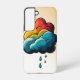 Eine kleine Kreatur oder Charakter, die über einen pfirsichfarbenen Sonnenuntergangshimmel gleitet - wie ein Fantasieballon.