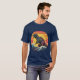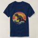 Dieses T - Shirt-Design zeigt eine dynamische und lebendige Abbildung eines Kaiju, eines riesigen Monsters, das aus den Meereswellen mit einer kraftvollen Haltung hervorgeht. Der Kaiju ist detailliert mit einer strukturierten, schuppigen Haut in aquamarinen und lila Farbtönen, mit bedrohlichen roten Augen und scharfen, gezackten Rückenfinnen. Es scheint zu brüllen und zeigt seine furchtbaren Zähne. Der Hintergrund ist ein lebhafter Sonnenuntergang, der von einem großen Sonnenuntergang in Gelb, Orange und Rosa geprägt ist, der ein dramatisches Licht über die Szene wirft. Der Himmel ist mit horizontalen Linien übersät, die die Retro-Ästhetik ergänzen. Die Ozeanwellen sind in kühnen, fließenden Linien in Blau- und Weißtönen illustriert, was die enormen Auswirkungen des Monsters unterstreicht, das durch das Wasser abstürzt. Dieses Design verbindet klassische Monsterfilme perfekt mit lebendigem, künstlerischem Flair und eignet sich somit hervorragend für Kaiju-, Retro- und Illustrationsliebhaber.