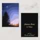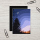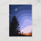 Diese Kunsthandwerkskarte zeichnet ein Bild eines friedlichen Planeten. Es ist Dämmerung und alles ist ruhig. Der helle Himmel ist eine Palette von indigofarben, blau, rosa, gelb und rot. Kiefernbäume werden mit den Sonnenuntergangsfarben versilbert. Ein winziger Mondschlauch hoch oben am Himmel schaut auf die Szene herunter.
