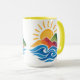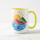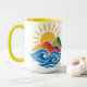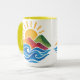 Enjoy your favorite hot drink with this ceramic mug featuring a vibrant design of a radiant sun rising behind colorful mountains and blue ocean waves. Perfect for coffee, tea, or hot chocolate, this artistic mug adds tranquility, nature-inspired beauty, and retro charm to your daily routine.