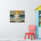 A seascape with the sun low over the horizon, reflecting across calm water and a rocky shoreline. The composition focuses on light, horizon, and open space in a simplified coastal setting.
