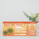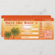 Desteis Hochzeit in Urlaubsort Save the Date Kartendesign mit einem Imitat Boarding Pass Look Thema. Das Design umfasst tropisch grüne Palmen Silhouetten, die Sonne, drei fliegende Vogel-Silhouetten und ein Flugzeug-Silhouette. Der Hintergrund ist ein wunderschöner Orangengraben, der dem Design einen warmen Sonnenuntergang im Abend verleiht. Das Design hat mehrere personalisierbare Textbereiche perfekt für das Schreiben des Datums der Hochzeit, die Namen der heiraten Menschen und sogar den Ort der Hochzeit. Es gibt auch eine QR-Code-Vorlage, die ideal ist, um Gäste auf die Hochzeitswebsite des Paares zu führen.