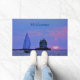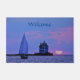 Willkommen in einem sicheren Hafen, wenn man vorbeisegelt, um einen Besuch abzustatten. Landschaftliches Sonnenuntergang Segelboot und Leuchtturm mit robuster Begrüßungstüre.