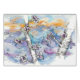 Eine naturgetreue Blankokarte mit blühenden Baumzweigen, die in schwarzem Stift und Tinte mit einem Hintergrund eines bewölkten Sonnenuntergangshimmels in Aquarellfarbe gezeichnet ist.