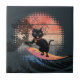 Sonnenuntergang Wave-Riding Katzengestein: Eine schwarze Katze surft auf einer Welle, wobei die Sonne in Rosa- und Orangetönen untergeht, was eine skurrile und surreale Szene schafft.