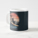 Sunset Wave-Riding Cat Große Kaffee Tasse : Eine schwarze Katze surft auf einer Welle, die in Rosa und Orange untergeht und eine surreale Szene schafft.