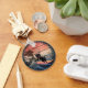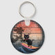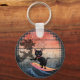 Sunset Wave-Riding Cat Schlüsselanhänger: Eine schwarze Katze surft auf einer Welle, die in Rosa- und Orangetönen untergeht und eine surreale und skurrile Szene schafft.