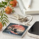 Sunset Wave-Riding Cat Schlüsselanhänger: Eine schwarze Katze surft auf einer Welle, die in Rosa- und Orangetönen untergeht und eine surreale und skurrile Szene schafft.