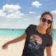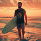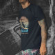 Sunset Wave-Riding Cat T - Shirt: Eine schwarze Katze surft auf einer Welle, die in Rosa- und Orangetönen untergeht und eine surreale und skurrile Szene schafft.