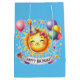 Machen Sie Ihren Lieben ein Lächeln mit unserer Sunshine Individuelle Name Happy Birthday Blue Medium Geschenktasche! Die mit einem Lächeln geschmückte Sonne mit einem Geburtstagshut, Dekorationen, Ballons und Sternen verströmt Freude und Spaß. Ideal, um bei jeder Geburtstagsfeier eine Touch Sonnenschein hinzuzufügen!