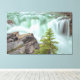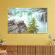 Das Bild zeigt einen landschaftlichen Sonnenwapta-Fall im Jasper Nationalpark, mit verschwommenem, fließendem Wasser in Weiß- und Hellgrün. Im Vordergrund steht ein kleiner immergrüner Baum, dessen grüne Nadeln den grauen und braunen Felsen kontrastieren. Die Felsen sind mit kleinen, grünen Moos bedeckt. Der Hintergrund zeigt mehr von dem Wasserfall und felsigen Gelände.
