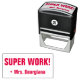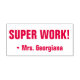 Dieses lustige Design aus Gummi-Briefmarke beinhaltet die positive Botschaft "SUPER WORK!" und einen personalisierten Tutor-Namen. Es könnte von einem Lehrer oder Erzieher verwendet werden, wenn sie Aufgaben markieren, um anzuerkennen, dass der Schüler eine großartige Arbeit geleistet hat.