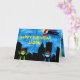 Super Helden auf dem Boden und fliegen in einer regengetränkten Stadt mit Wolkenkratzern aufsteigen in der Ferne. Perfekt für diesen super Held Geburtstagsjunge!