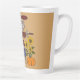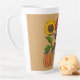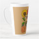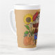 Cafe Latte Coffee Cup Tasse gedruckt mit Super Niedlich Scarecrow Artwork Design Illustration von TheFabricSeal unter Zazzle.com. Herbstsaison, Erntedank und Halloween sind alle gute Zeiten des Jahres. Dieses bezaubernde whimsical zeichn mit einer super niedlichen Keule mit einem albernen Grin, Kürbisse und Sonnenblumen war eine Menge Spaß zu schaffen. Die Skarele hat einen wunderschönen orangen roten Baseballhut, braunen Pullover, blaue Hosen, Strohhaare, Hände, Füße und Körper. Herrliche gelbe Sonnenblumen mit ihren köstlichen Sonnenblumenkernen, die auf großen Blume wachsen, Pflanze grüne Weinreben und Blätter sowie einige leckere Orangenkürbis runden dieses spaßige und skurrile Landschaftsbild ab.