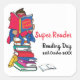Lesen des Tagesablesens auf einem Stapel der Veranstaltungsaufkleber des Buches. Passen Sie Ihre Lesetage mit Datum und Leistung an. Original Superheld-Junge, der auf einem Stapel Bücher sitzt, in denen er Superhelden zeichne und Design von www.mylittleeden.com liest