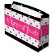Super zauberhafte pinkfarbene polka-gepunktete Papiertüte mit Griffen. Personalisieren Sie den Text nach Ihrem eigenen Motto im Shop, fügen Sie Ihr Firmenlogo hinzu, um es zu Ihrem eigenen zu machen. Farben können alle auf Ihre eigene Store-Farbe oder Veranstaltungsfarben geändert werden. Designer Geschenktasche geeignet für jeden Anlass. Die Farben sind hell rosa, schwarz und weiß.
