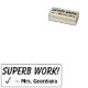 Dieses motivierende Design aus Gummi-Briefmarke zeichnet sich durch die motivierende Botschaft "SUPERB WORK!" und den Namen eines Lehrers aus. Es ist auch mit einem dekorativen Karo versehen. Es könnte von einem Lehrer oder Erzieher verwendet werden, wenn sie Aufgaben markieren, um anzuerkennen, dass der Schüler gut abgeschnitten hat.