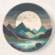 Eine abstrakte Landschaft eines gewaltigen Supermonds in einer Bergsee-Szene mit einer Vogelherde in kühnen Texturen und dunkelerdigen Tönen aus Braun, Beige, Bräune, Blau, Zyan und Schwarz.