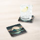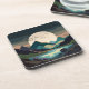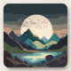 Eine abstrakte Landschaft eines gewaltigen Supermonds in einer Bergsee-Szene mit einer Vogelherde in kühnen Texturen und dunkelerdigen Tönen aus Braun, Beige, Bräune, Blau, Zyan und Schwarz.
