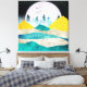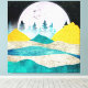 A beautiful landscape with unique textures showing a huge supermoon rising in a mountain landscape with rolling hills and trees in shades of blue, cyan, gold, and yellow.