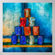 Pyramide von zehn leeren Suppendosen in Weiß, Blau und Rot gegen die Wand aus Grunge-Metall. Einige Dosen werden durchgeschossen. Poster zur Dekoration einer Zuhause oder eines Büros für jedermann.
