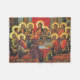 bunte Malerei in den Rottönen und in den Golden "des letzten Abendessens" durch Simon ushakov. Jesus ist an einem langen rechteckigen Tisch mit zwölf Aposteln mit goldenen Halos. Weinbecher und Goldservierplatte mit Brot am Tisch in einem Innenraum, der mit einem schönen Rot verziert wird, drapieren. helle mutige Farben und schön ausgewogene Malerei mit einem reizenden Fluss der goldenen Halos, die ein spielerisches Muster schaffen. dekorative, Ikonenart und in das 17. Jahrhundert einer hellen und mutig farbigen ikonographischen Artmalerei der Geschichte des neuen Testaments des letzten Abendessens gemalt.